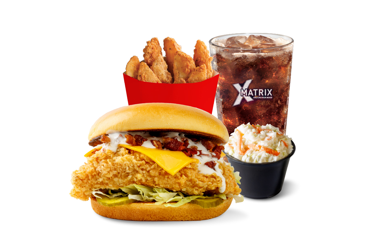 Crispy chicken fillet, topped with crispy beef bacon bits, cheese, lettuce, pickles, & ranch.